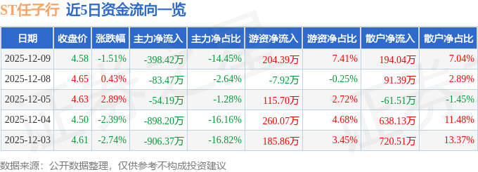 12月9日的资金流向数据方面,主力资金净流出398.42万元,占总成交额14.45%,游资资金净流入204.39万元,占总成交额7.41%,散户资金净流入194.04万元,占总成交额7.04%。