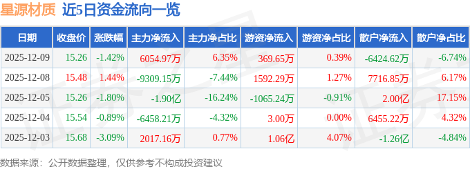 证券之星消息,截至2025年12月9日收盘,星源材质(300568)报收于15.26元,下跌1.42%,换手率5.15%,成交量62.78万手,成交额9.54亿元。