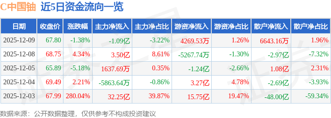 证券之星消息,截至2025年12月9日收盘,C中国铀(001280)报收于67.8元,下跌1.38%,换手率31.8%,成交量50.27万手,成交额33.9亿元。