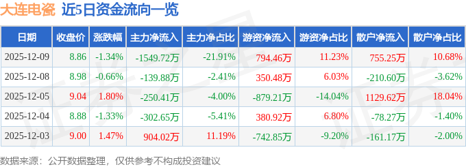 证券之星消息,截至2025年12月9日收盘,大连电瓷(002606)报收于8.86元,下跌1.34%,换手率1.88%,成交量7.91万手,成交额7072.68万元。