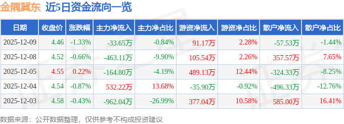 12月9日的资金流向数据方面,主力资金净流出33.65万元,占总成交额0.84%,游资资金净流入91.17万元,占总成交额2.28%,散户资金净流出57.53万元,占总成交额1.44%。