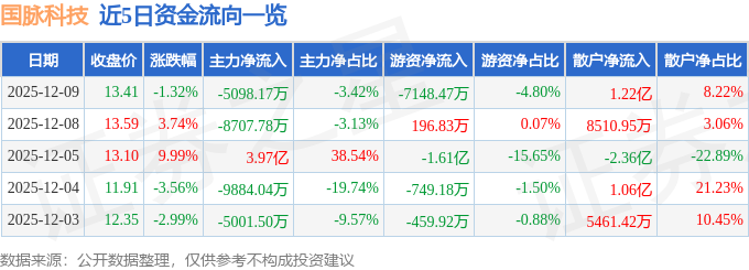 12月9日的资金流向数据方面,主力资金净流出5098.17万元,占总成交额3.42%,游资资金净流出7148.47万元,占总成交额4.8%,散户资金净流入1.22亿元,占总成交额8.22%。
