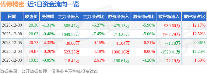 证券之星消息,截至2025年12月9日收盘,优德精密(300549)报收于20.36元,下跌1.31%,换手率3.9%,成交量3.94万手,成交额8059.47万元。