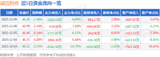 证券之星消息,截至2025年12月9日收盘,诚迈科技(300598)报收于46.38元,下跌1.3%,换手率2.95%,成交量6.39万手,成交额2.99亿元。