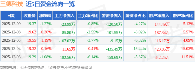 证券之星消息,截至2025年12月9日收盘,三德科技(300515)报收于19.37元,下跌1.27%,换手率0.72%,成交量1.44万手,成交额2818.82万元。