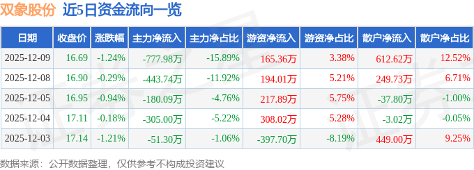证券之星消息,截至2025年12月9日收盘,双象股份(002395)报收于16.69元,下跌1.24%,换手率1.08%,成交量2.91万手,成交额4894.73万元。