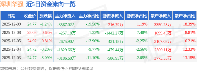 证券之星消息,截至2025年12月9日收盘,深圳华强(000062)报收于24.77元,下跌1.24%,换手率0.7%,成交量7.3万手,成交额1.82亿元。