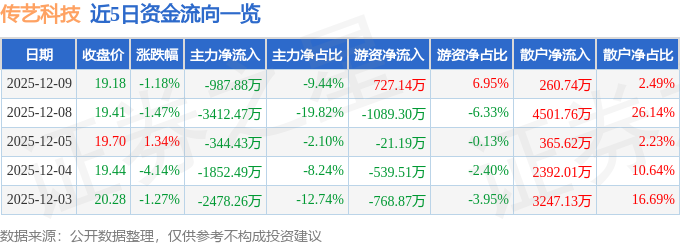 证券之星消息,截至2025年12月9日收盘,传艺科技(002866)报收于19.18元,下跌1.18%,换手率2.99%,成交量5.43万手,成交额1.05亿元。