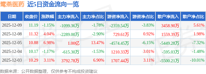 证券之星消息,截至2025年12月9日收盘,鹭燕医药(002788)报收于11.19元,下跌1.15%,换手率14.18%,成交量54.13万手,成交额6.17亿元。