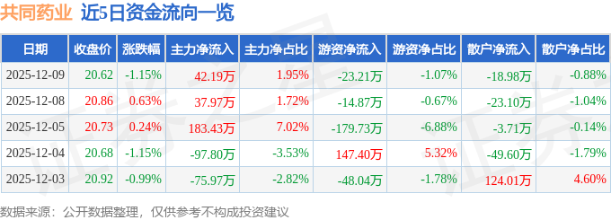 证券之星消息,截至2025年12月9日收盘,共同药业(300966)报收于20.62元,下跌1.15%,换手率1.37%,成交量1.04万手,成交额2165.34万元。