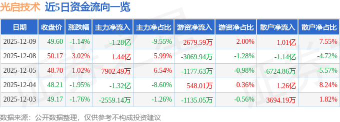 12月9日的资金流向数据方面,主力资金净流出1.28亿元,占总成交额9.55%,游资资金净流入2679.59万元,占总成交额2.0%,散户资金净流入1.01亿元,占总成交额7.55%。