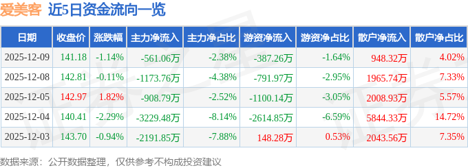 12月9日的资金流向数据方面,主力资金净流出561.06万元,占总成交额2.38%,游资资金净流出387.26万元,占总成交额1.64%,散户资金净流入948.32万元,占总成交额4.02%。