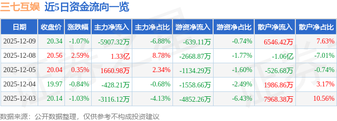 证券之星消息,截至2025年12月9日收盘,三七互娱(002555)报收于20.34元,下跌1.07%,换手率2.63%,成交量42.05万手,成交额8.58亿元。