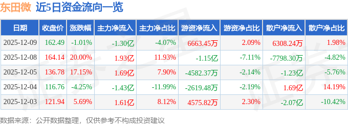 证券之星消息,截至2025年12月9日收盘,东田微(301183)报收于162.49元,下跌1.01%,换手率32.75%,成交量19.2万手,成交额31.91亿元。