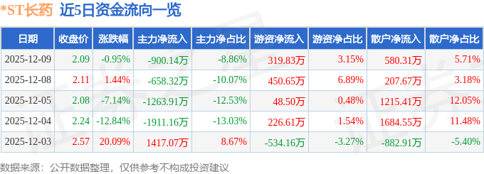 证券之星消息,截至2025年12月9日收盘,*ST长药(300391)报收于2.09元,下跌0.95%,换手率14.14%,成交量49.54万手,成交额1.02亿元。