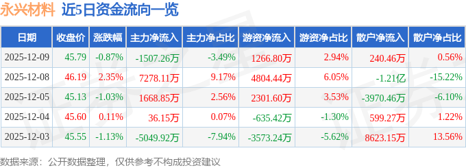 证券之星消息,截至2025年12月9日收盘,永兴材料(002756)报收于45.79元,下跌0.87%,换手率2.42%,成交量9.41万手,成交额4.32亿元。