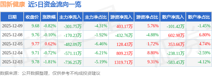 证券之星消息,截至2025年12月9日收盘,国新健康(000503)报收于9.68元,下跌0.82%,换手率0.74%,成交量7.22万手,成交额6999.05万元。