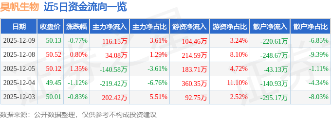 证券之星消息,截至2025年12月9日收盘,昊帆生物(301393)报收于50.13元,下跌0.77%,换手率1.51%,成交量6376.0手,成交额3221.65万元。