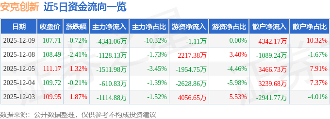 证券之星消息,截至2025年12月9日收盘,安克创新(300866)报收于107.71元,下跌0.72%,换手率1.3%,成交量3.92万手,成交额4.21亿元。