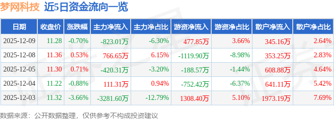 证券之星消息,截至2025年12月9日收盘,梦网科技(002123)报收于11.28元,下跌0.7%,换手率1.59%,成交量11.46万手,成交额1.31亿元。