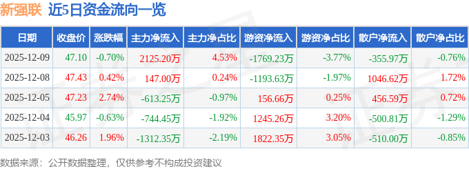12月9日的资金流向数据方面,主力资金净流入2125.2万元,占总成交额4.53%,游资资金净流出1769.23万元,占总成交额3.77%,散户资金净流出355.97万元,占总成交额0.76%。