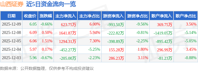 证券之星消息,截至2025年12月9日收盘,山西证券(002500)报收于6.05元,下跌0.66%,换手率0.48%,成交量17.12万手,成交额1.04亿元。