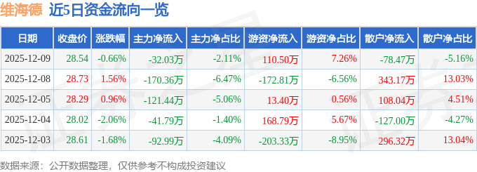 证券之星消息,截至2025年12月9日收盘,维海德(301318)报收于28.54元,下跌0.66%,换手率0.7%,成交量5308.0手,成交额1521.21万元。
