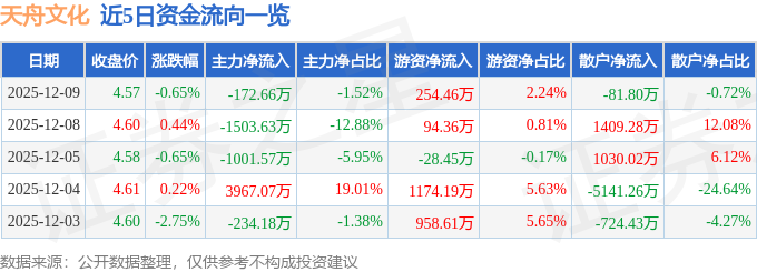 证券之星消息,截至2025年12月9日收盘,天舟文化(300148)报收于4.57元,下跌0.65%,换手率3.02%,成交量24.59万手,成交额1.13亿元。