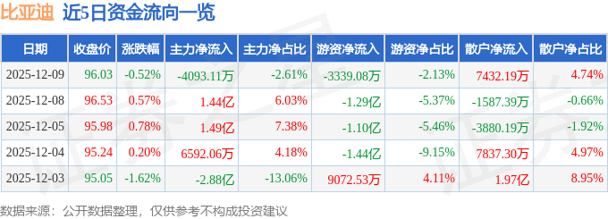 证券之星消息,截至2025年12月9日收盘,比亚迪(002594)报收于96.03元,下跌0.52%,换手率0.47%,成交量16.32万手,成交额15.68亿元。