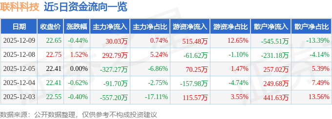 12月9日的资金流向数据方面,主力资金净流入30.03万元,占总成交额0.74%,游资资金净流入515.48万元,占总成交额12.65%,散户资金净流出545.51万元,占总成交额13.39%。