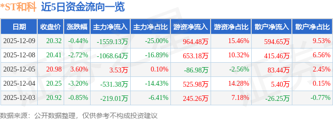 证券之星消息,截至2025年12月9日收盘,*ST和科(002816)报收于20.32元,下跌0.44%,换手率3.11%,成交量3.11万手,成交额6236.86万元。
