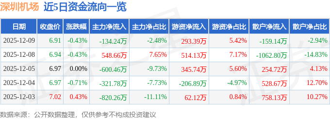 证券之星消息,截至2025年12月9日收盘,深圳机场(000089)报收于6.91元,下跌0.43%,换手率0.38%,成交量7.81万手,成交额5411.22万元。