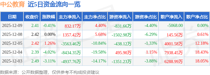 证券之星消息,截至2025年12月9日收盘,中公教育(002607)报收于2.41元,下跌0.41%,换手率1.54%,成交量78.31万手,成交额1.89亿元。