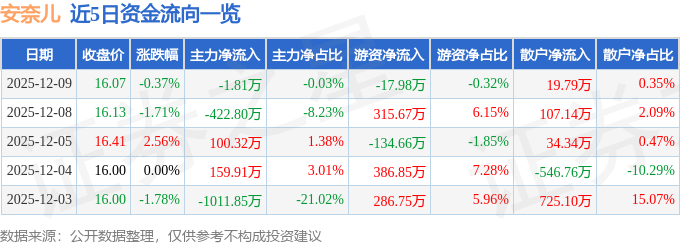 证券之星消息,截至2025年12月9日收盘,安奈儿(002875)报收于16.07元,下跌0.37%,换手率1.93%,成交量3.51万手,成交额5707.86万元。