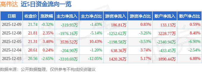 12月9日的资金流向数据方面,主力资金净流出319.93万元,占总成交额1.43%,游资资金净流入186.81万元,占总成交额0.83%,散户资金净流入133.13万元,占总成交额0.59%。