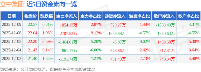 证券之星消息,截至2025年12月9日收盘,立中集团(300428)报收于22.57元,下跌0.31%,换手率2.77%,成交量16.05万手,成交额3.67亿元。