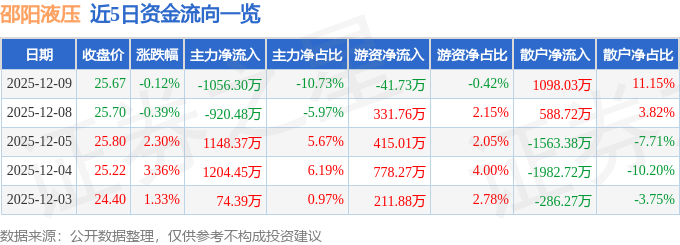 证券之星消息,截至2025年12月9日收盘,邵阳液压(301079)报收于25.67元,下跌0.12%,换手率5.53%,成交量3.85万手,成交额9845.68万元。