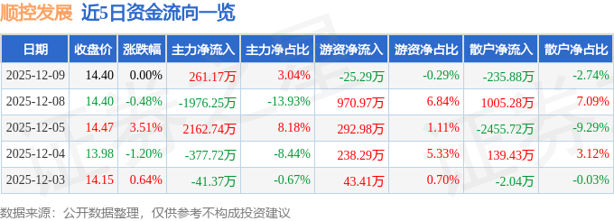 证券之星消息,截至2025年12月9日收盘,顺控发展(003039)报收于14.4元,上涨0.0%,换手率0.97%,成交量5.96万手,成交额8600.58万元。