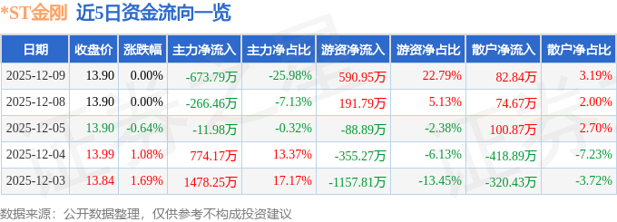 证券之星消息,截至2025年12月9日收盘,*ST金刚(300093)报收于13.9元,上涨0.0%,换手率0.67%,成交量1.87万手,成交额2593.15万元。