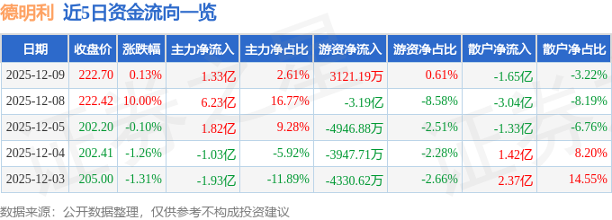 证券之星消息,截至2025年12月9日收盘,德明利(001309)报收于222.7元,上涨0.13%,换手率14.02%,成交量22.55万手,成交额51.1亿元。