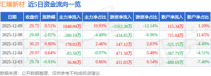 证券之星消息,截至2025年12月9日收盘,汇隆新材(301057)报收于29.75元,上涨0.51%,换手率3.83%,成交量3.16万手,成交额9585.42万元。