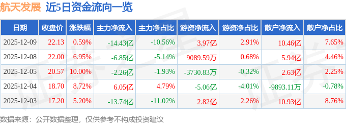 证券之星消息,截至2025年12月9日收盘,航天发展(000547)报收于22.13元,上涨0.59%,换手率38.64%,成交量613.77万手,成交额136.71亿元。