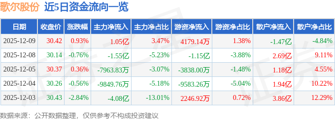 证券之星消息,截至2025年12月9日收盘,歌尔股份(002241)报收于30.42元,上涨0.93%,换手率3.19%,成交量100.08万手,成交额30.38亿元。
