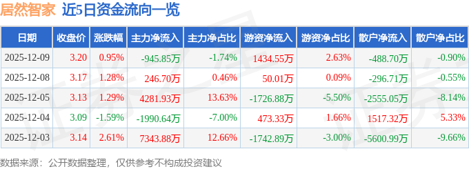 证券之星消息,截至2025年12月9日收盘,居然智家(000785)报收于3.2元,上涨0.95%,换手率2.92%,成交量171.98万手,成交额5.45亿元。