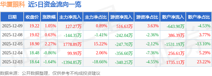 证券之星消息,截至2025年12月9日收盘,华厦眼科(301267)报收于19.22元,上涨1.05%,换手率1.14%,成交量7.39万手,成交额1.42亿元。