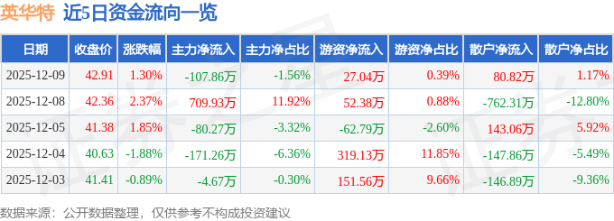 12月9日的资金流向数据方面,主力资金净流出107.86万元,占总成交额1.56%,游资资金净流入27.04万元,占总成交额0.39%,散户资金净流入80.82万元,占总成交额1.17%。