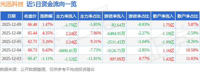 证券之星消息,截至2025年12月9日收盘,光迅科技(002281)报收于66.4元,上涨1.47%,换手率5.77%,成交量44.98万手,成交额29.87亿元。