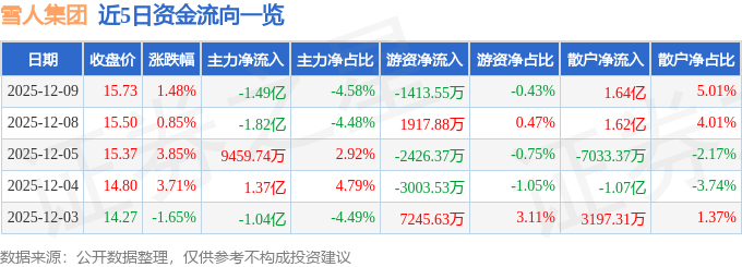证券之星消息,截至2025年12月9日收盘,雪人集团(002639)报收于15.73元,上涨1.48%,换手率31.15%,成交量202.68万手,成交额32.61亿元。