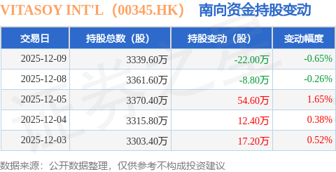证券之星消息,12月9日南向资金减持22.0万股VITASOY INT'L(00345.HK)。近5个交易日中,获南向资金增持的有3天,累计净增持53.4万股。近20个交易日中,获南向资金增持的有17天,累计净增持232.0万股。截至目前,南向资金持有VITASOY INT'L(00345.HK)3339.6万股,占公司已发行普通股的3.19%。