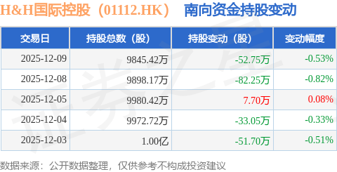 证券之星消息,12月9日南向资金减持52.75万股H&H国际控股(01112.HK)。近5个交易日中,获南向资金减持的有4天,累计净减持212.05万股。近20个交易日中,获南向资金减持的有14天,累计净减持349.65万股。截至目前,南向资金持有H&H国际控股(01112.HK)9845.42万股,占公司已发行普通股的15.24%。